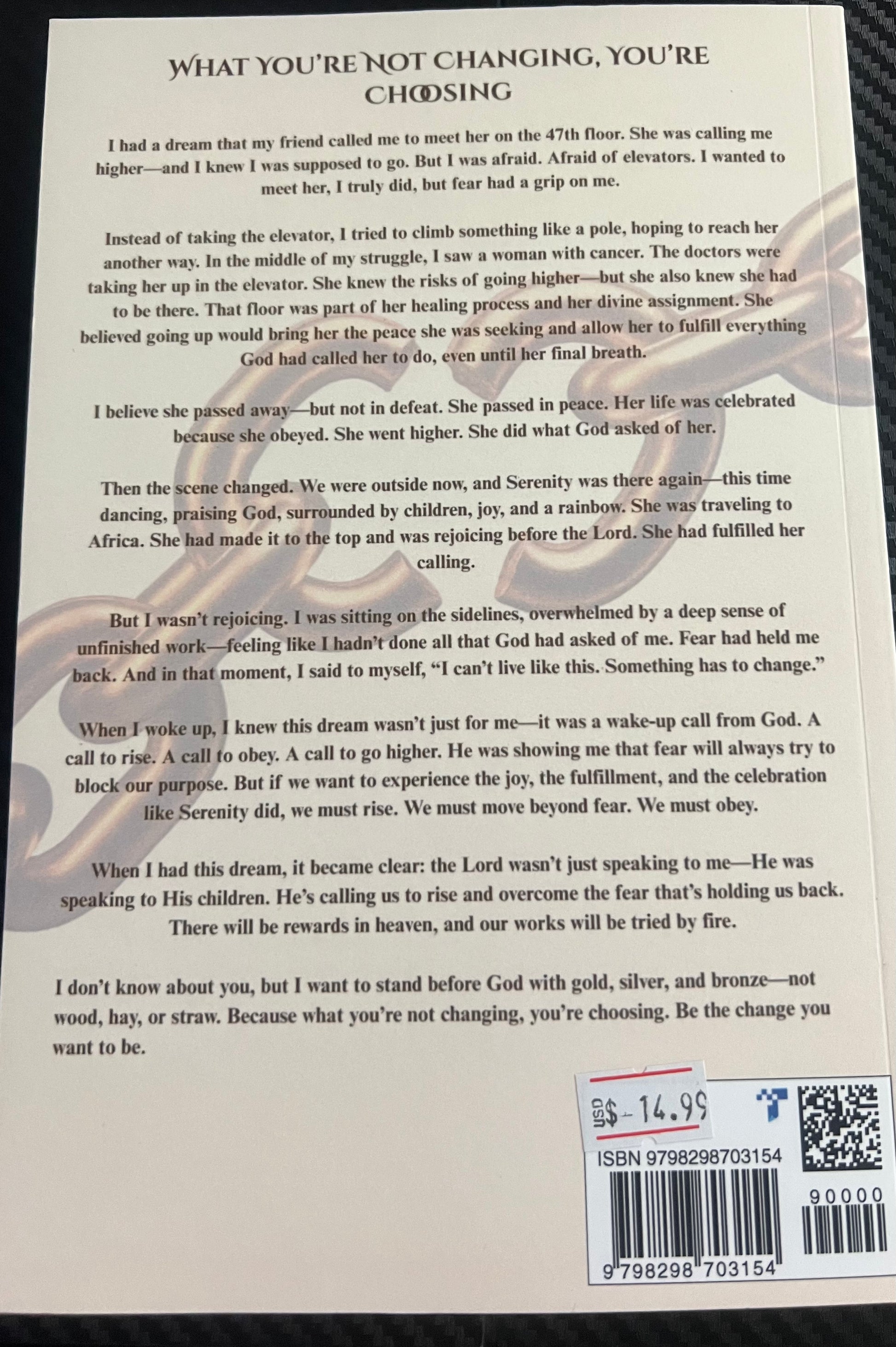 Whether it's fear of failure, rejection, change, or the unknown, this book will help you recognize the root of those fears and show you how to replace them with truth, identity, and boldness. Through real testimonies, powerful scriptures, and honest reflections, Overcoming Fear will lead you closer to God, strengthen your relationship with Him, and help you step fully into your God-given purpose.