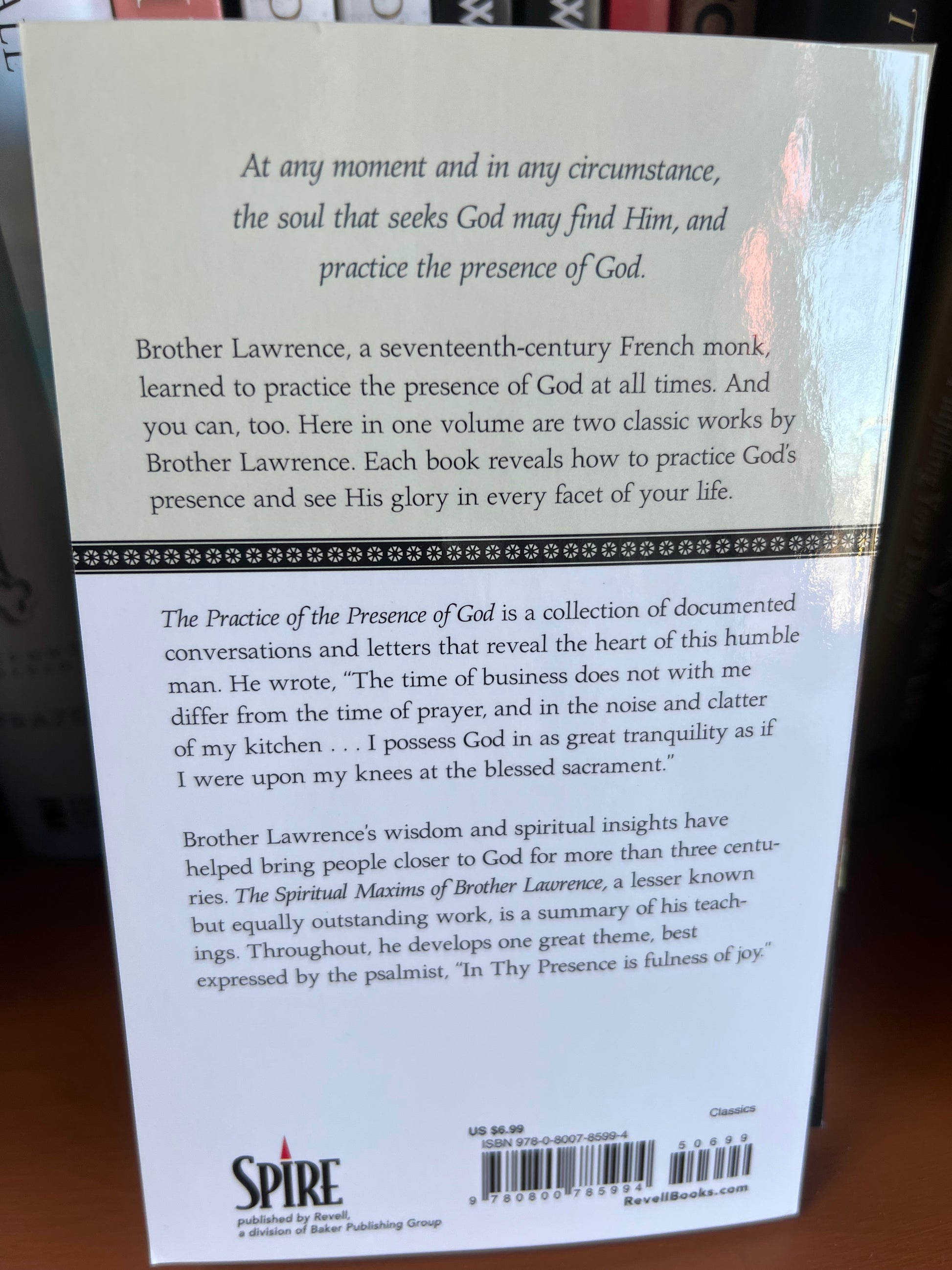 For three centuries the writings of Brother Lawrence have taught Christians that God is as present in the kitchen as in the cathedral and as accessible in the living room as He is around the Lord's table. This simple, yet profound teaching will empower you to seek the joy of God's presence in the midst of every moment and circumstance.